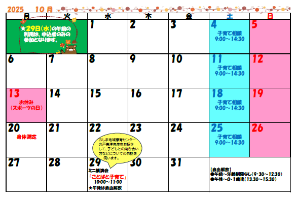 ・季節の制作(こいのぼり・七夕・敬老の日・クリスマス・ひなまつりなど)・言葉と子育て・英語であそぼう・シコトレ・おもちゃライブラリーで遊ぼう(あいよる21)